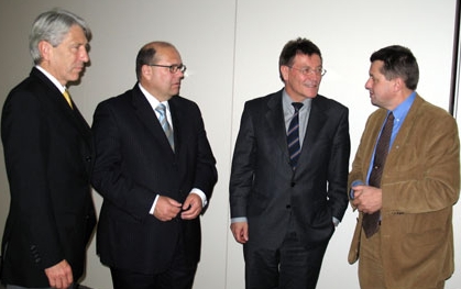 Rudolf Fellner im Gespräch mit Staatsminister Sinner und Hauptgeschäftsführer Hinterdobler HWK Ndb./ Opf. zum Thema Regionalentwicklung anläßlich einer Veranstaltung des Wirtschaftsbeirats der Union e.V. in Deggendorf am 3. November 2004.