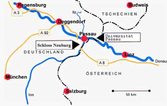 dem Zug: Hauptbahnhof Passau, von dort mit dem Taxi oder zu Fuß (10 Min.) Mit dem Auto: Autobahn A3 (Regensburg - Deggendorf - Passau) Ausfahrt Passau SÜD Richtung Passau; in Passau vor der JET Tankstelle (auf der linken Seite) nach rechts abbiegen; den Berg hinunter; am Klinikum links abbiegen in die Innstrasse; ca. 500 m bis zum GW II. Parken Sie bitte in der Tiefgarage dieses Hörsaalgebäudes und folgen Sie dann der Beschilderung. Mit dem Flugzeug: Flughafen München von dort S-Bahn zum Hauptbahnhof München und dann mit dem Zug nach Passau. Einen genauen Lageplan der Universität Passau finden Sie unter der Homepage der Universität. |